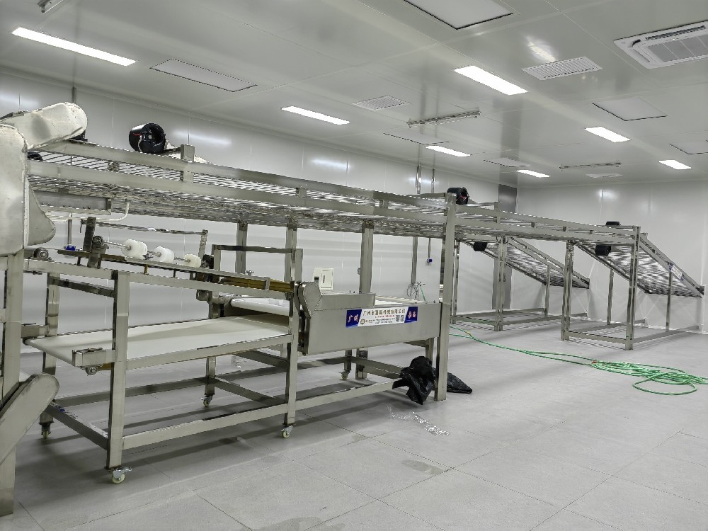 2.该机结构设计合理,米浆的蒸煮部分和河粉的冷却部分分体设置,令到河粉的冷却效果更加理想,同时蒸煮生产区与成品收集区可作分割成为独立的工作间,使成品间的工作环境更加卫生, 更符合河粉加工厂的卫生要求。